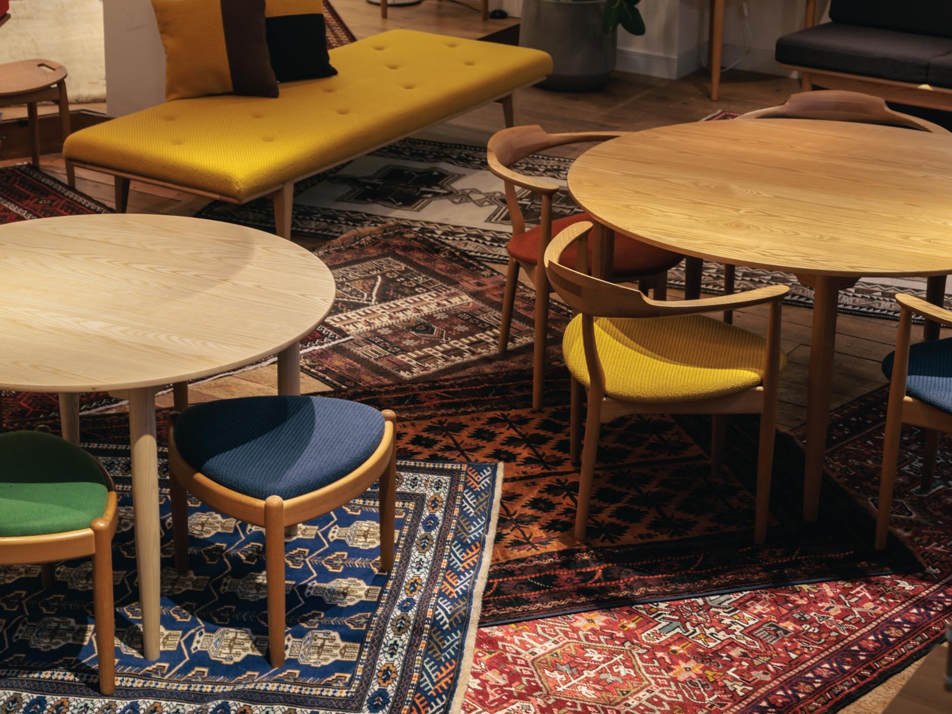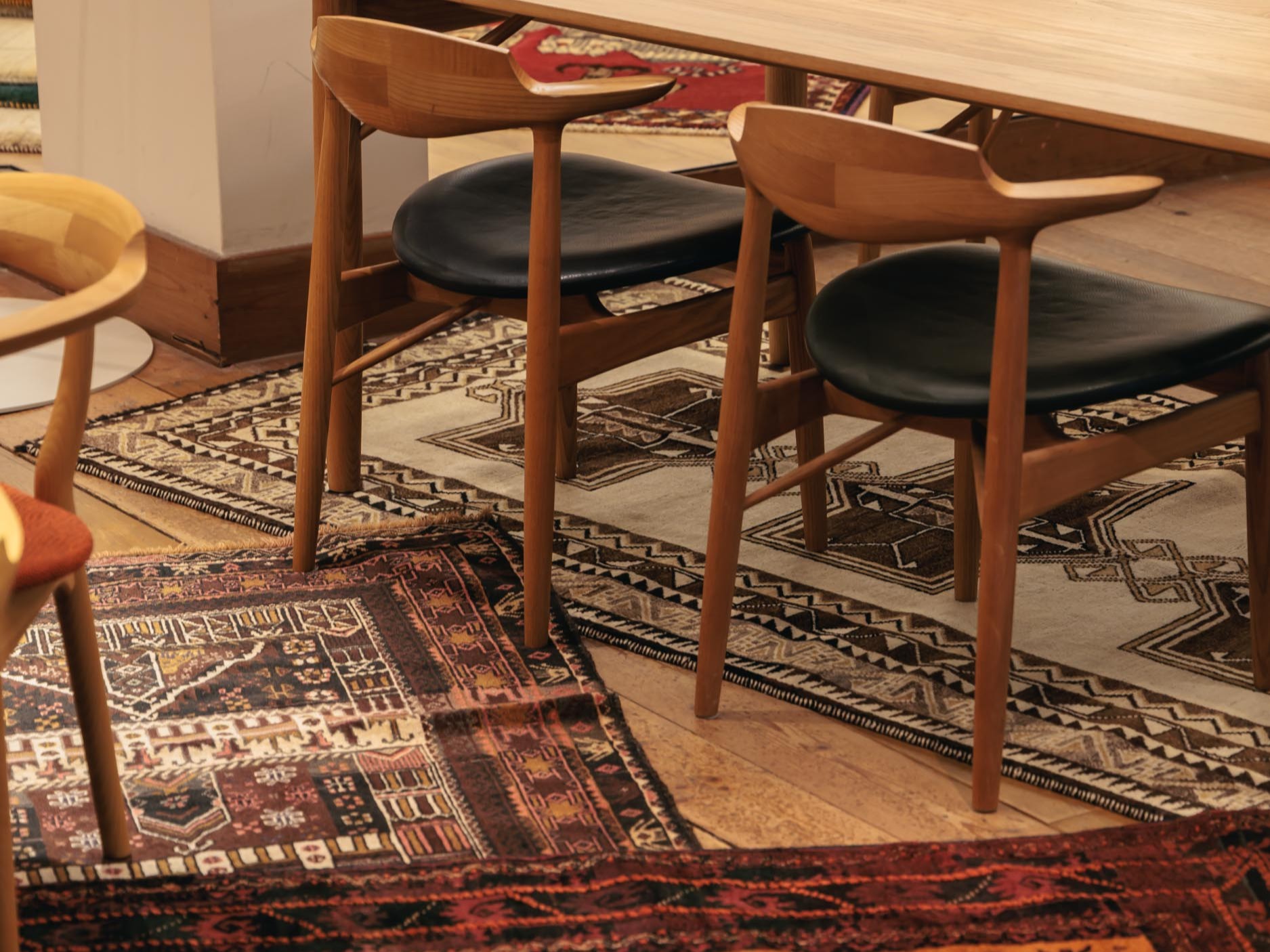 同じものは二つとないラグたちを、SINKEN STYLE furnitureの職人がつくる家具とともに展示。